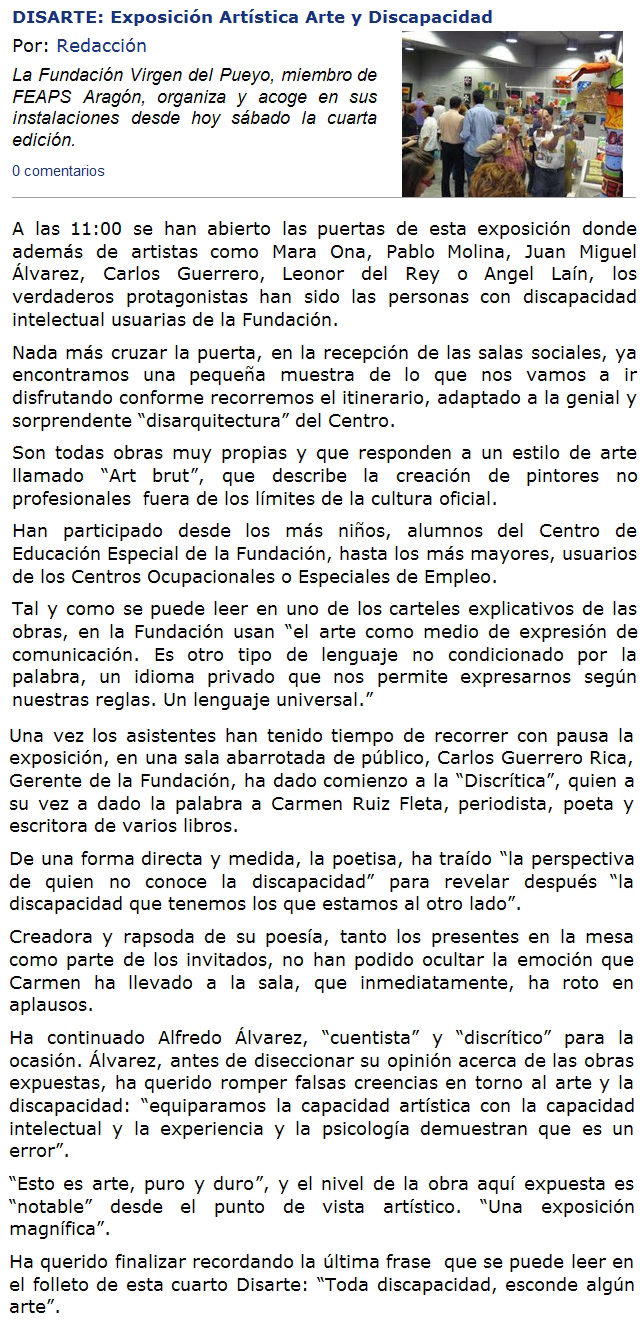 Reportaje sobre Disarte 4ª Edición, «Arte Sostenible y Discapacidad», emitido en Aragón Noticias el 30 de Septiembre de 2011.