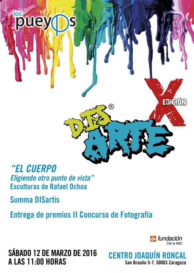 Tenemos el placer de invitaros a la 10ª Edición de DISARTE, muy especial ya que celebramos las diez ediciones realizadas. Este espacio artístico pretende acercar el arte al mundo de la discapacidad y viceversa, en esta ocasión y dada la importancia del evento, lo celebraremos el próximo día 12 de Marzo a las 11:00 horas en el Centro Joaquín Roncal, sito en calle San Braulio, 5-7, os esperamos a todos.