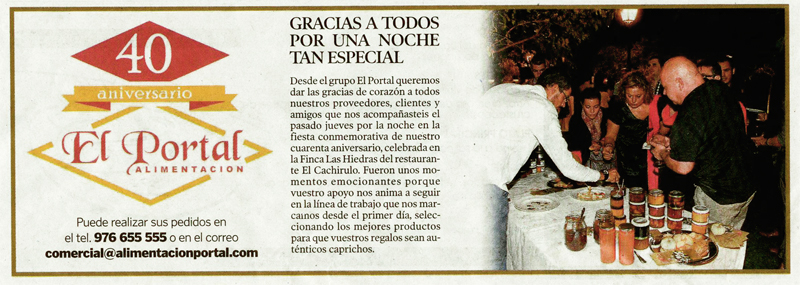 El pasado 13 de Septiembre tuvo lugar la celebración del 40 Aniversario de Alimentación El Portal, que se celebró en el marco incomparable de los jardines de la finca «Las hiedras», del restaurante «El Cachirulo», en un ambiente muy elegante los numerosos invitados disfrutaron de los productos de gran calidad que se sirvieron, acompañados en todo momento por una fantástica banda de Jazz.