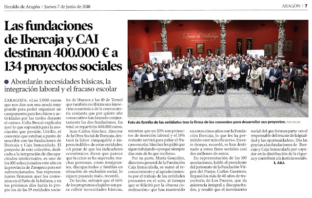 Os dejamos el artículo publicado ayer, jueves 7 de junio, sobre el acto de Firma de la Convocatoria de Proyectos Sociales de la Fundación Ibercaja y Fundación Caja Inmaculada con diversas entidades sociales, entre ellas la nuestra. Además en el acto intervino nuestro presidente, Carlos Guerrero, como representante de ellas.