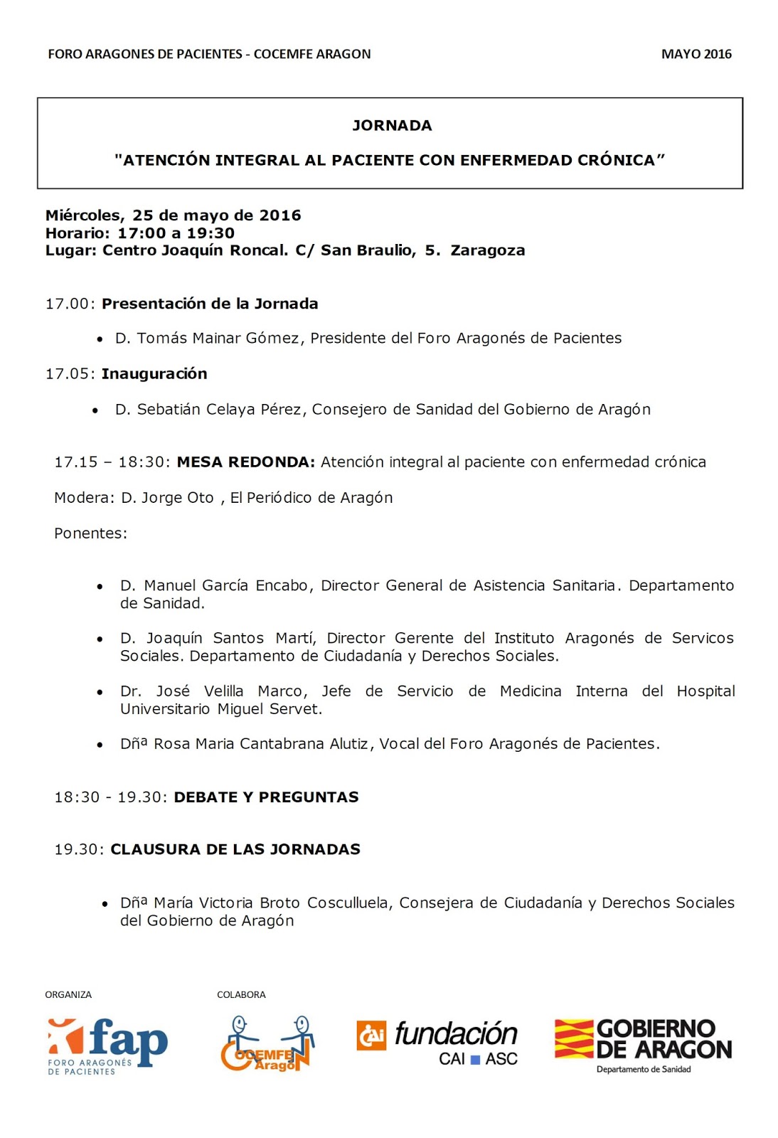 La Jornada de Salud que organiza anualmente el Foro Aragonés de Salud, del que forma parte nuestra Fundación, este año versará sobre la “ATENCIÓN INTEGRAL AL PACIENTE CON ENFERMEDAD CRÓNICA”. Tendrá lugar el próximo 25 de mayo de 2016, de 17:00 a 20:00h, en el Centro Joaquín Roncal.