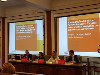 El pasado martes, 2 de octubre, asistimos a la presentación en la Cámara de Comercio de Zaragoza del informe «Radiografía del Tercer Sector Social en España, oportunidades en un entorno cambiante» elaborado por la Fundación PwC, que se refiere a aquellas entidades sin ánimo de lucro que trabajan en el sector de los servicios sociales. Este estudio fue presentado por el presidente de Pwc España, Jesús Díaz de la Hoz, quien manifestó que la recuperación de la financiación del tercer sector social no se alcanzará en términos reales hasta 2020.