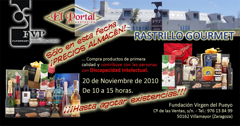 Estimados amigos, el próximo Sábado 20 de Noviembre de 2010, de 10:00 a 15:00 horas, vamos a celebrar el primer RASTRILLO GOURMET, en el que vas a encontrar una gran variedad de productos de PRIMERA CALIDAD a precio de ALMACÉN.