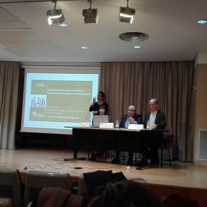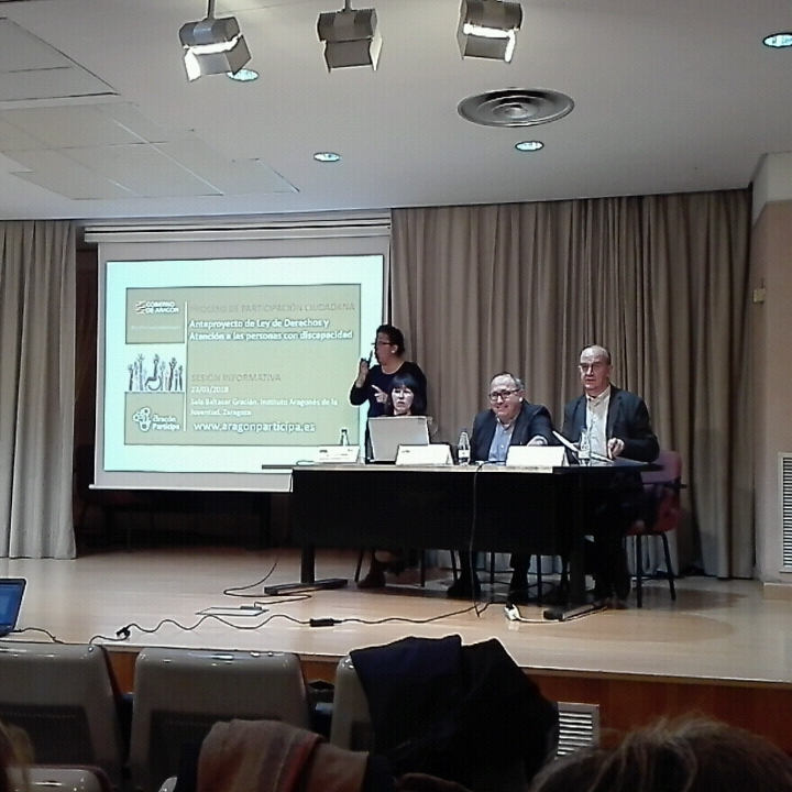 Hoy se ha celebrado una interesante sesión informativa sobre el proceso de participación ciudadana para la elaboración del anteproyecto de Ley de Derechos y la Atención a las Personas con Discapacidad, en el Instituto Aragonés de la Juventud. Los ponentes han hecho una presentación del anteproyecto de Ley y nos han solicitado la participación ciudadana a través de talleres presenciales y herramientas online dispuestas en su página web.