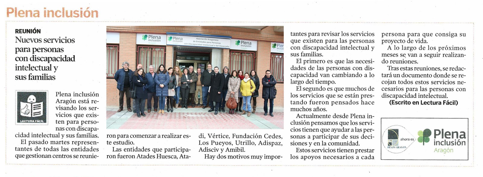 Aquí os dejamos la noticia publicada en Sin Barreras de Heraldo de Aragón el pasado viernes 16 de febrero, en la que se recoge la reunión que tuvo lugar el martes 13 entre todas las entidades miembro de Plena Inclusión Aragón para la elaboración de una nueva propuesta de catálogo de servicios inclusiva y centrada en cada persona.