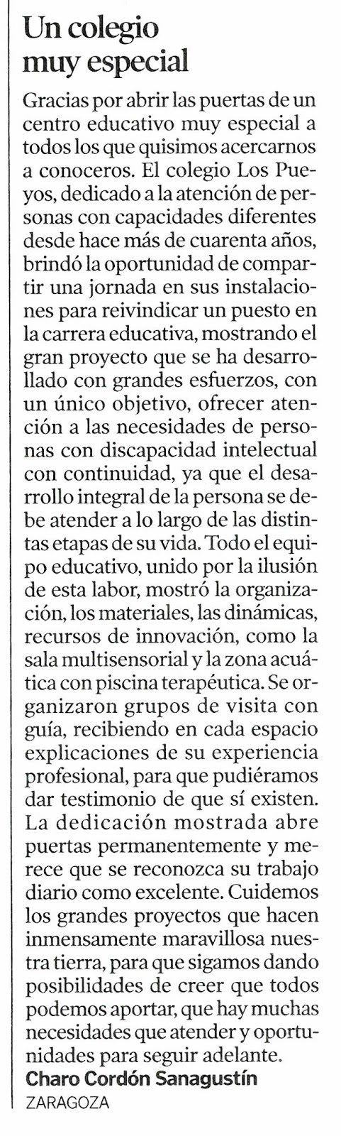 El sábado 26 de mayo, se publicó en Heraldo de Aragón esta «Carta al Director» sobre el Colegio Los Pueyos y su Jornada de puertas abiertas celebrada el pasado 10 de marzo. Agradecemos mucho a su autora, Charo Cordón Sanagustín, las palabras.